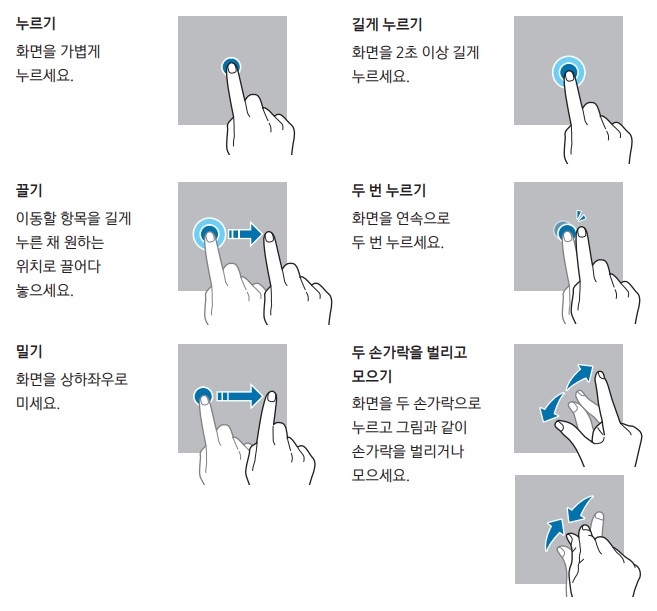누르기 | 화면을 가볍게 누르세요. 기능을 실행하거나 원하는 메뉴를 선택할 때, 화면에 나타나는 버튼을 가볍게 누르세요. |