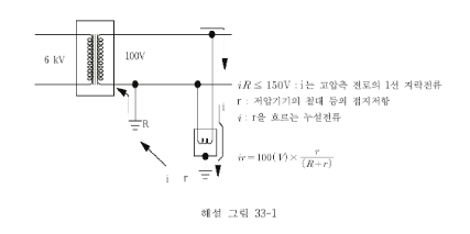 300V 이하의 저압인 것에서는 제3종 접지공사(100 2 이하, 판단기준 제18조 및 제20조)를 하면 좋은 것으로 하고 있지만 보통 300V 이하의 저압전로에서는 변압기 시설 개소에 제2종 접지공사가 행해지기 때문에(판단기준 제23조) 비접지측 전선의 부분에서 완전 접촉한 경우에는 해설 그림 33-1의 예로 보는 바와 같이 순환에 의해 철대 등에는 그 접지저항값과 제2종 접지공사 저항값과의 비에 의해 정해지는 전위가 나타난다. 따라서 절대 등의 접지저항값은 저압전로의 제2종 접지공사 저항값과 협조를 하여 가능한 낮은 값으로 하는 것이 바람직하다.